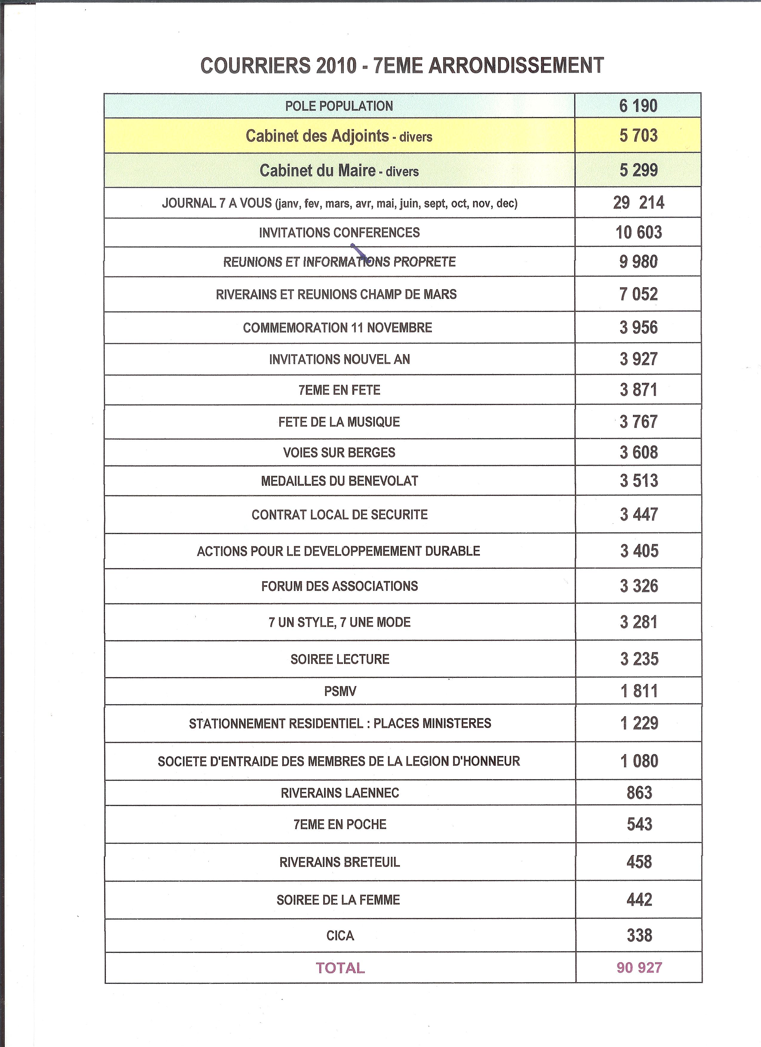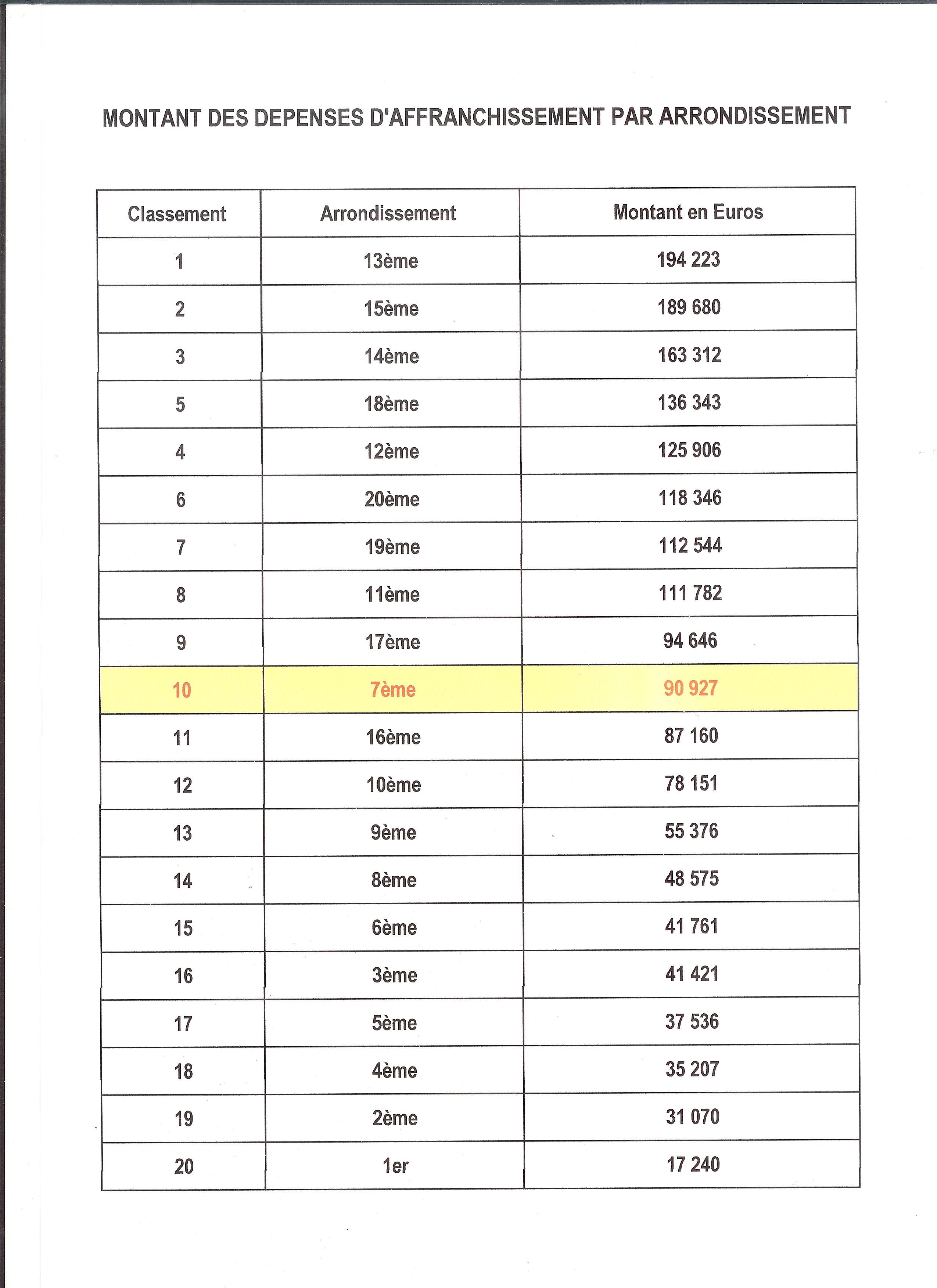 Présenté sous forme de classement des 20 mairies d'arrondissement, le palmarès place la mairie du 7e arrondissement en 10e position des dépenses en timbres avec un montant total de 90 927 euros en 2010 ; à mi-parcours, placée juste devant la mairie du 16e arrondissement avec 87 160 euros de dépenses en frais d'affranchissement.
