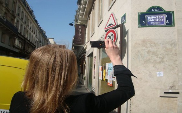 Mobilier urbain à Paris : affiches "Impasse Sarkozy"