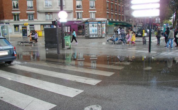 La pluie inonde régulièrement un passage piéton, le trottoir et la chaussée porte d'Orléans. Reliant les deux côtés du boulevard Jourdan au niveau de la Place du 25 août 1944, dans le 14e arrondissement de Paris, le trottoir, le passage piéton, et...