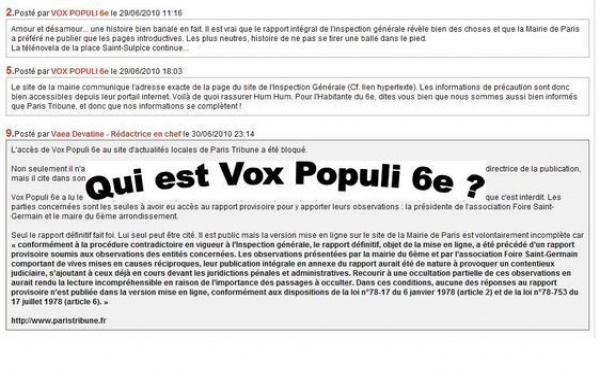 Sous le pseudo de « Vox Populi » puis de « Vox Populi 6e », un individu cherche à utiliser Paris Tribune pour influencer l'opinion en diffusant de fausses informations tout en poursuivant aussi le but de discréditer Paris Tribune, le journal...