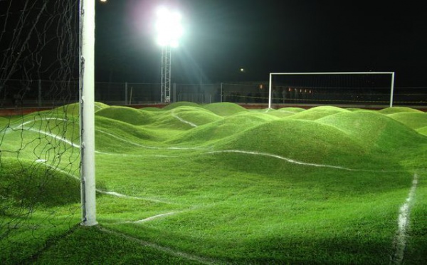 Un terrain de foot bien particulier. Revisité par l'artiste Priscilla Monge, sa surface est artistiquement accidenté. La partie est impossible, les règles du jeu sont inapplicables. Cette déstabilisation voulue force chacun à revoir ses positions....