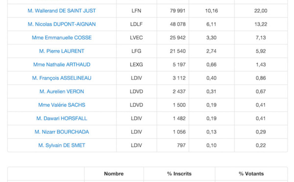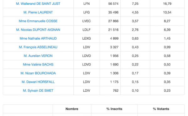 Les résultats définitifs de la Préfecture de région Ile-de-France. Dans le 91, les Républicains arrivent en tête avec 23,88 % des suffrages exprimés. En deuxième position : le Parti Socialiste avec 23,56 %. En troisième position : le Front...