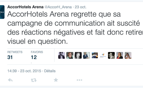 L'Adjoint au Maire de Paris au sport et au tourisme, les élus Communistes et Ecologistes de Paris font retirer une publicité d'AccorHotels Arena. Le groupe AccorHotels Arena, qui a donné son nom le 14 octobre 2015 à l'ex-Palais omnisports de Paris...