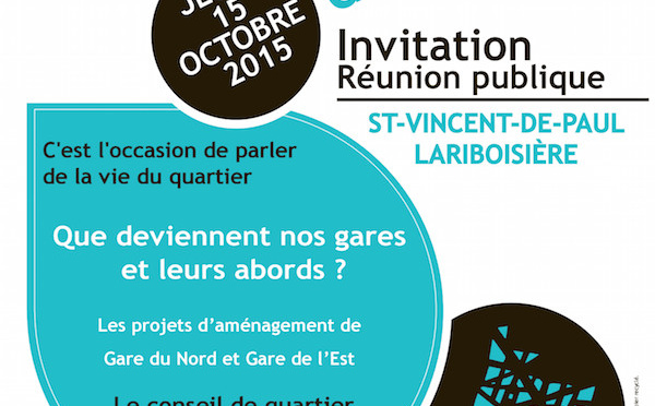 Réunion publique le jeudi 15 octobre de 19h à 21h à l'école élémentaire du 3 rue de Belzunce 75010. Le conseil du quartier Lariboisière - Saint Vincent de Paul se tient jeudi 15 octobre 2015 et s'appuie sur l'actualité récente du quartier des deux...