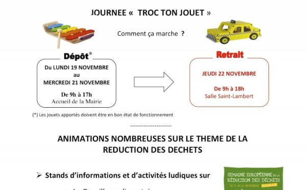 La semaine européenne de réduction des déchets dans le 15e arrondissement. A l’occasion de la Semaine Européenne de Réduction des Déchets, la mairie du 15e arrondissement organise une bourse d’échange de jouets du lundi 19 au jeudi 22 novembre.