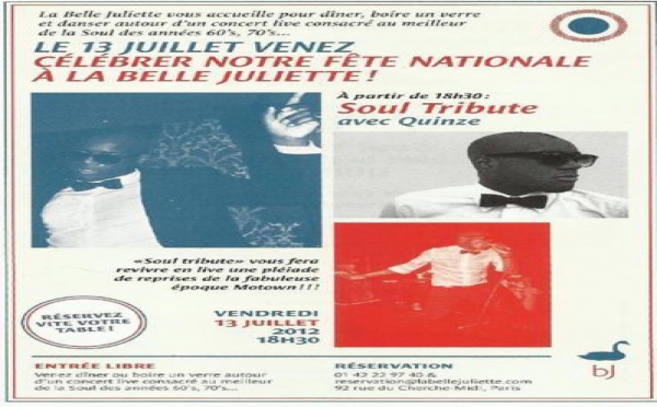 Célébrez la fête nationale à La Belle Juliette. Soul Tribute vous fera revivre en live une pléiade de reprises des plus grands interprètes soul de la fabuleuse époque de la Motown. La Belle Juliette vous accueille à la manière d'un club New-Yorkais...