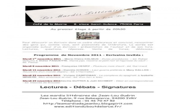 Mardi littéraire - le programme de novembre 2011 - au café de la mairie - au premier étage - place Saint Sulpice Paris 6ème