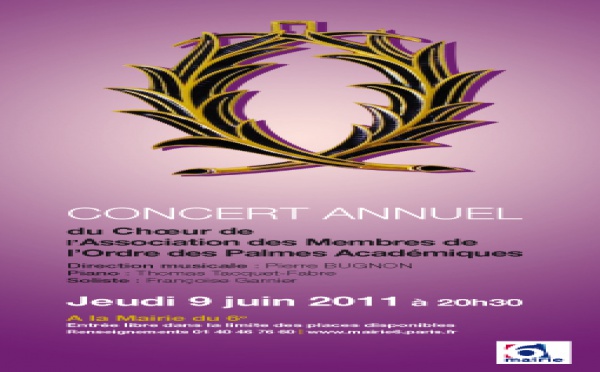 Le chœur de l'AMOPA, l'association des membres de l'ordre des palmes académiques, donne un concert, à la mairie du 6e, le jeudi 9 juin à 20h30. Le programme de ce récital placé sous la direction de Pierre Bugnon, avec Thomas Tacquet-Fabre au piano,...