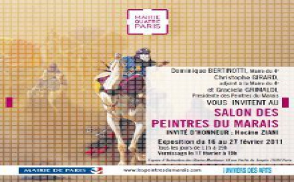 Dominique BERTINOTTI, Maire du 4e arrondissement, Christophe GIRARD, adjoint à la Maire et Graciela GRIMALDI, Présidente des Peintres du Marais vous invitent au salon des Peintres du Marais. Invité d'honneur : Hocine ZIANI. Entrée...