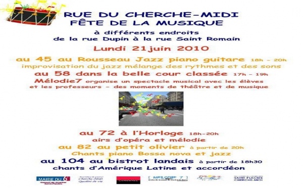 Animations prévues dans la rue du Cherche-Midi, entre la rue Dupin et la rue Saint-Romain. Le programme intégral des animations organisées par l'Association "Cherche-Midi Qualité de Vie" à l'occasion de la Fête de la Musique 2010. Article du 18...